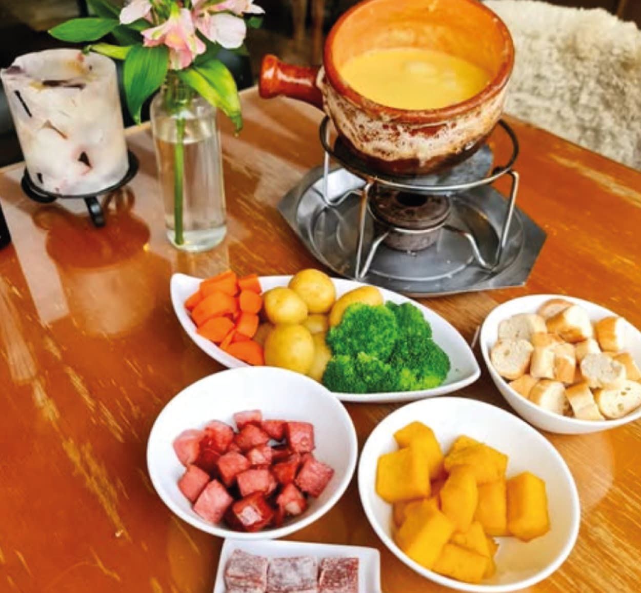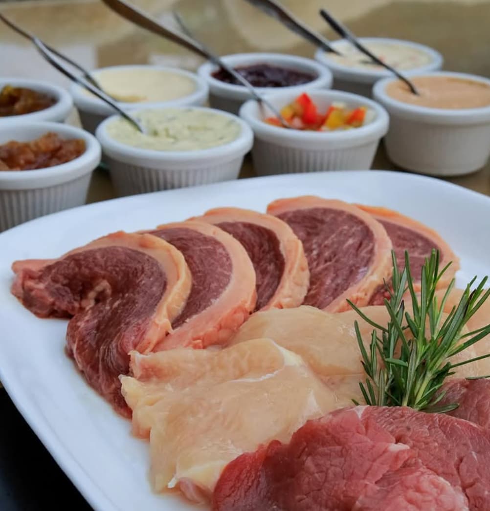 Fondue: sequência completa com queijo cremoso, carnes selecionadas e irresistível fondue de chocolate.